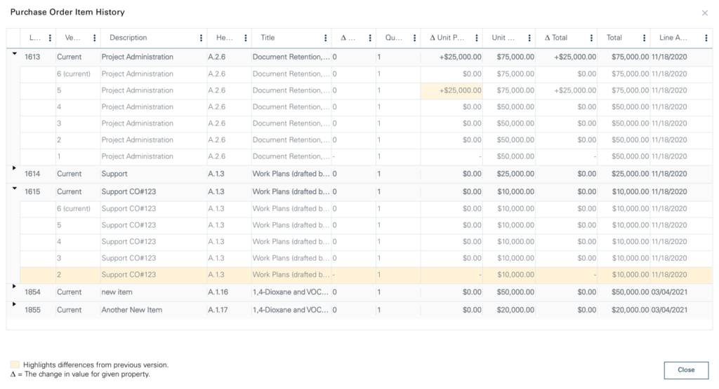A pop-up reflecting the history of each Line Item in your purchase order will appear. Each line item will show any changes that have been made in yellow.